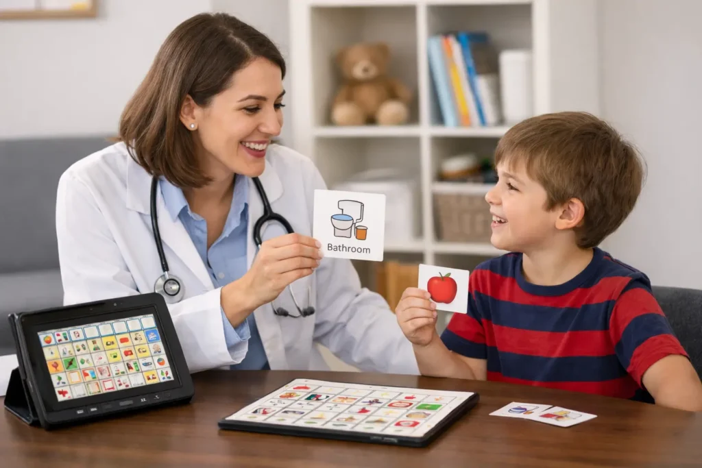 - Speech therapy focuses on functional communication, including spoken language, social communication skills, and AAC when needed.