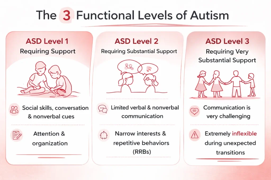 In the DSM-5 and DSM-5-TR, autism is classified into three levels of severity (Levels 1–3). They reflect how much support a person may need in daily life and are evaluated separately in two areas: social communication and restricted or repetitive behaviors (RRBs).
